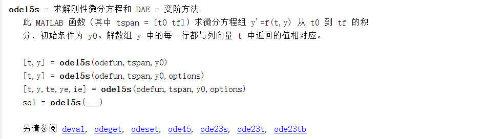 d) ode15s:是一种基于数字微分公式的解法器(NDFs)。也是一种多步解法器。适用于刚性系统,当用户估计要解决的问题是比较困难的,或者不能使用ode45,或者即使使用效果也不好,就可以用ode15s。