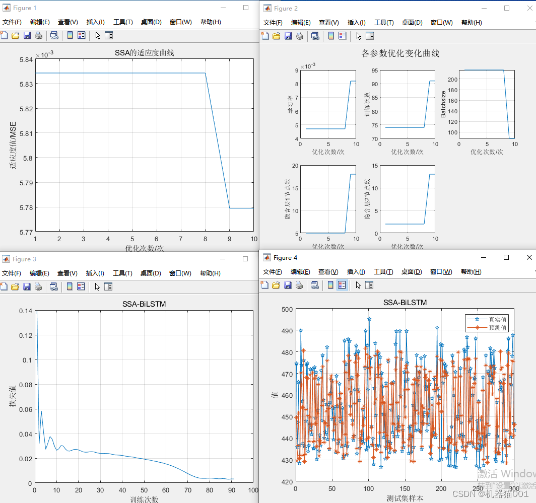 采用麻雀优化算法对BiLSTM的学习率,迭代次数,batchs ize,和各层节点数进行优化,结果如下: