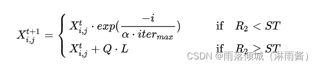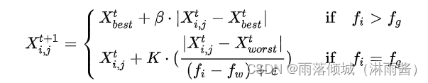 其中,Xp为最优探索者的位置,Xworst 为当前全局最差位置;n为种群规模。A为一 个1×d 的矩阵,每个元素随机幅值为1或-1,并且A+=AT(AAT)-1,当i >n/2时,这表明,适应度值较低的第i个加入者没有获得食物,处于十分饥饿的状态,此时需要飞往其它地方觅食,以获得更多的能量。