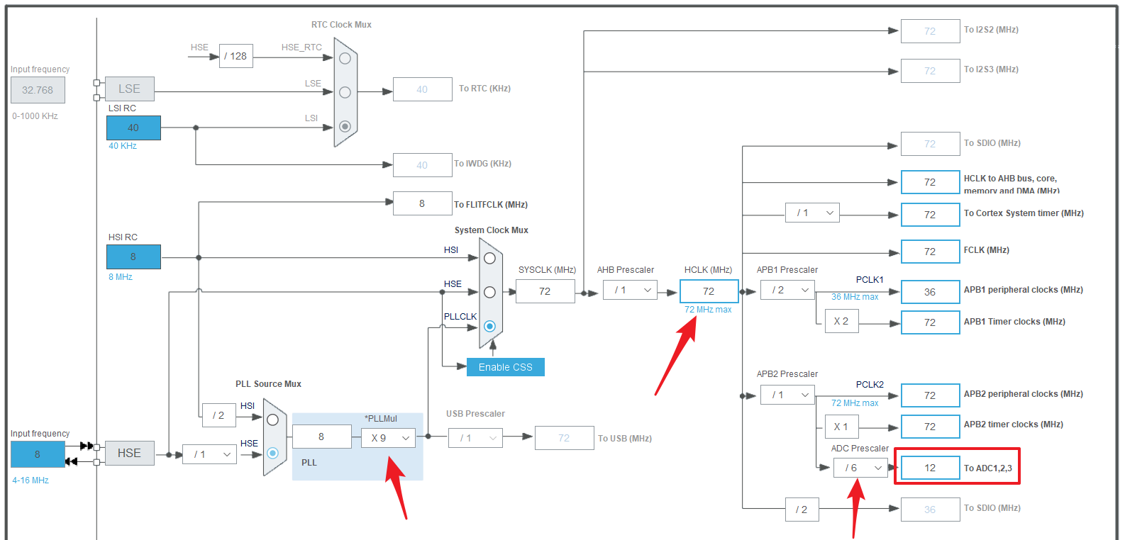 如果设置PLCK2为6分频,那么ADCCLK为:72M/6=12MHz。在外部晶振为8MHZ的情况下,这是F103系列ADC得到的最大时钟频率。