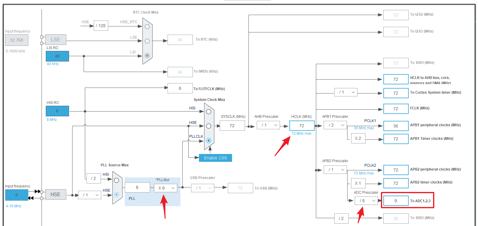 如果设置PLCK2为8分频,那么ADCCLK为:72M/8=9MHz。在外部晶振为8MHZ的情况下,这是F103系列ADC得到的最小时钟频率。