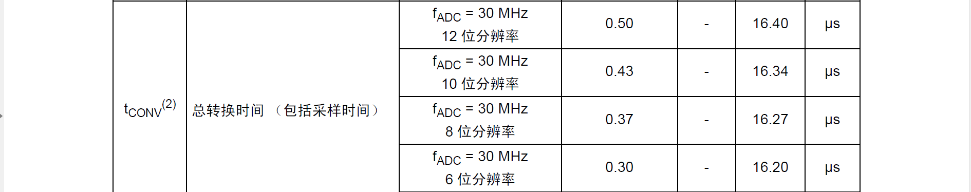 而转化时间与AD的位数成正比,每位需要一个采样周期。这样,就可以知道,一般的,选择3个周期采样时间的12位AD,完成一次转换需要花费的时钟周期为: