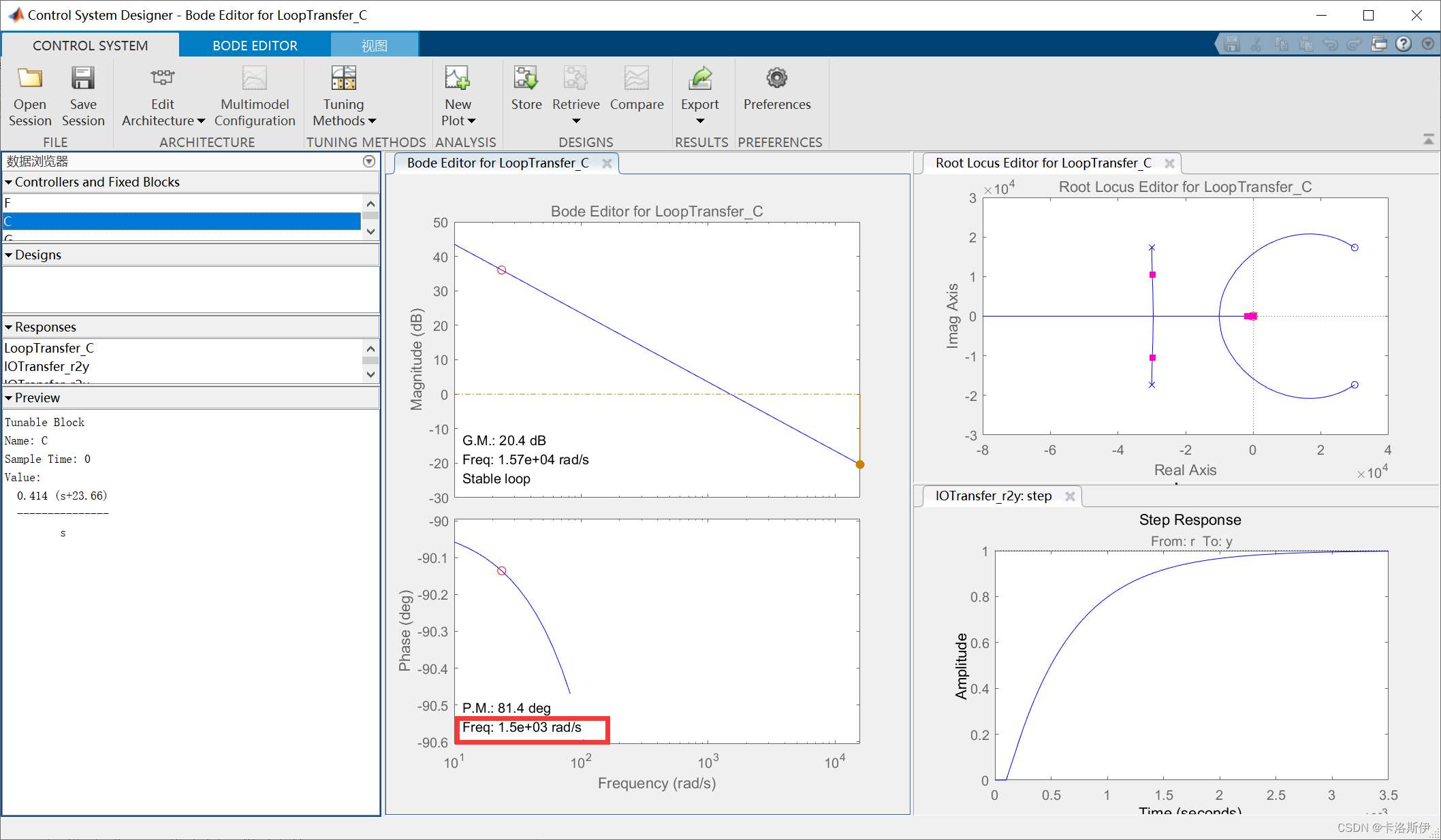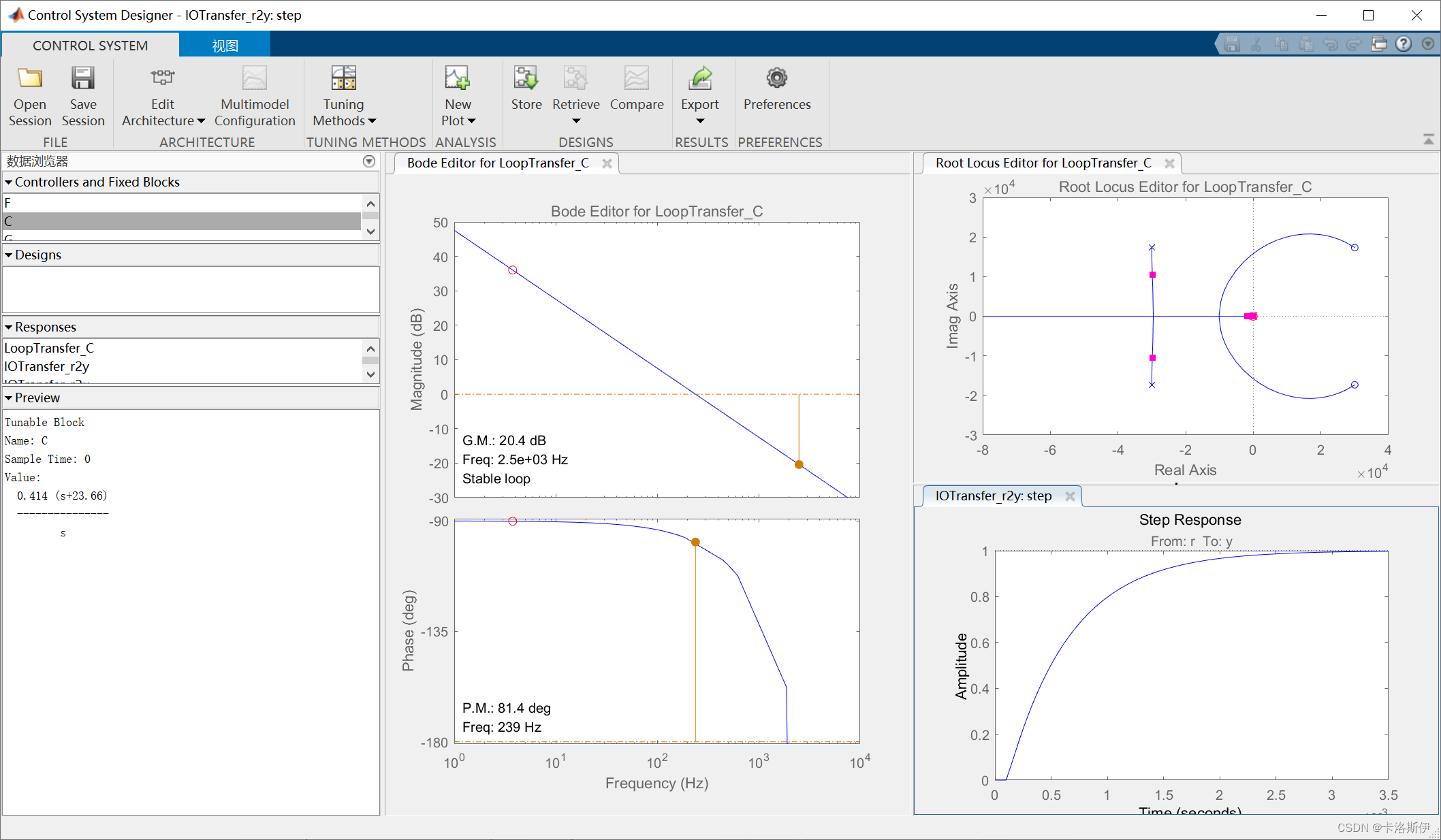 和我们之前算的一样239,系统的相位裕量和增益裕量也足够,系统稳定。通过方法二设计的PI参数,就可以让我们设计一个控制系统时看得到更多的信息,而不是试凑一个带宽或者一组PI参数。