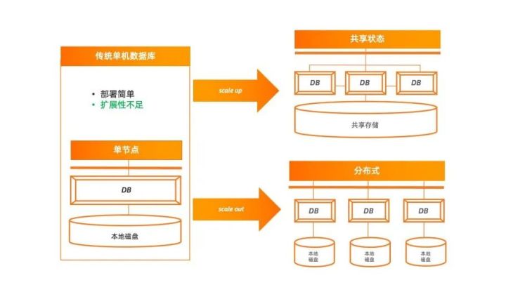 数据库经历过去40多年的发展,随着互联网、大数据的飞速发展,单台务器上的性能极限已经慢慢显露,在这种情况下,技术人员逐渐开始探索数据库的扩展能力,目前整体扩展架构又两种形态:基于共享存储的share-storage架构、以及基于share-nothing的分布式架构,这两种架构分别代表了两个不同的扩展思路,有各自的优缺点。