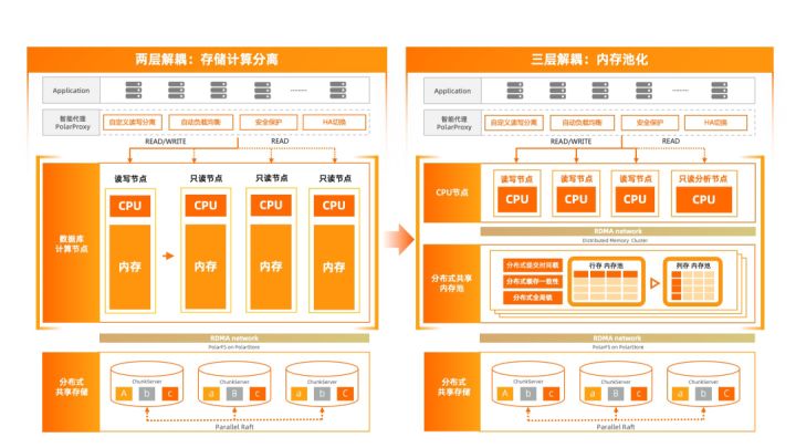 从40多年前数据库诞生开始,数据库的CPU和内存都是绑定在一起的,最多做到计算和存储解耦,没有数据库能做到CPU和内存的解耦,即使演进到目前的云原生数据库阶段,在PolarDB之前也没有任何数据库能够做到这一点。