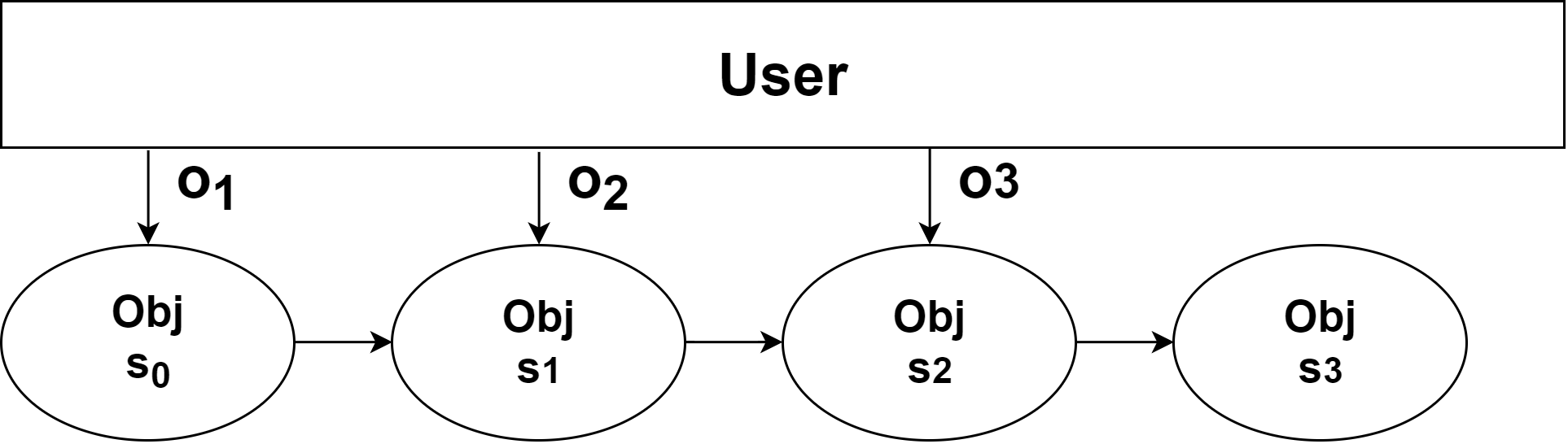 设用户对被操作对象 O b j Obj Obj,执行了 n n n 次操作为 o i , ( i = 1 , 2 , 3 , . . . , n ) o_i,(i=1,2,3,...,n) oi,(i=1,2,3,...,n)。每次操作前,被操作对象处于状态 s i , ( i = 0 , 1 , 2 , 3 , . . . , n ) s_i,(i=0,1,2,3,...,n) si,(i=0,1,2,3,...,n),其中 s 0 s_0 s0 为初始状态,即一开始用户尚未做任何操作时备操作对象的状态。基于上述描述我们可以得到以下图示,表示用户操作的过程。