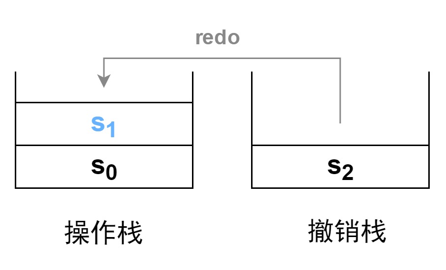 此时进行重做测试。进行一次重做,在撤销栈中弹出栈顶元素 s 1 s_1 s1 ,并将 s 1 s_1 s1 压入操作栈。此时被操作对象的状态重新指向 s 1 s_1 s1。完成重做操作。