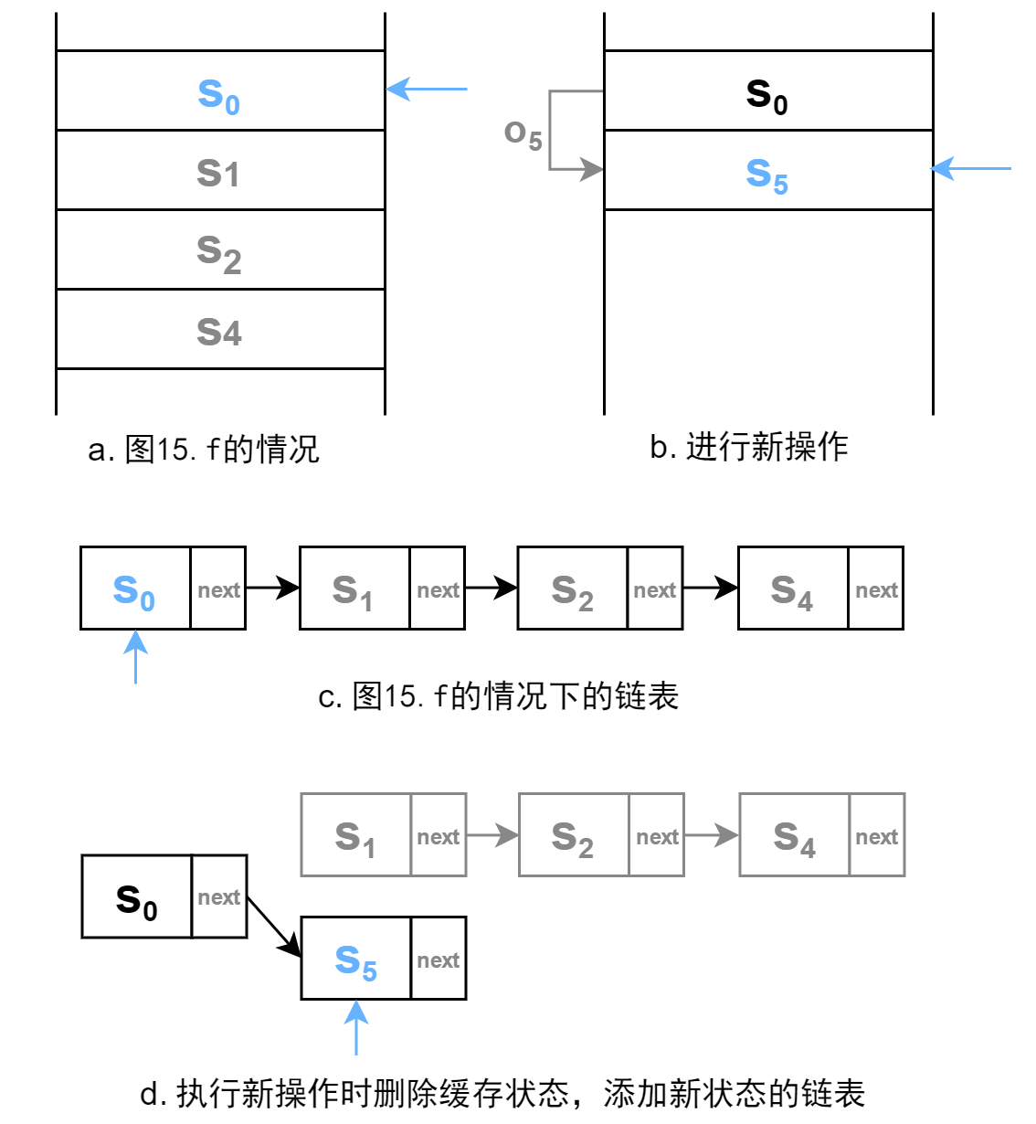 在上图中的 f 情况下,如果我们直接进行新操作,那么缓存的状态 x 1 x_1 x1、 x 2 x_2 x2、 x 4 x_4 x4 都要删除,此时链表的优势就体现出来了。只需要将指针指向的 s 0 s_0 s0 的下一个节点置为新操作产生的状态,就同时完成了删除三个状态与加入新状态了。