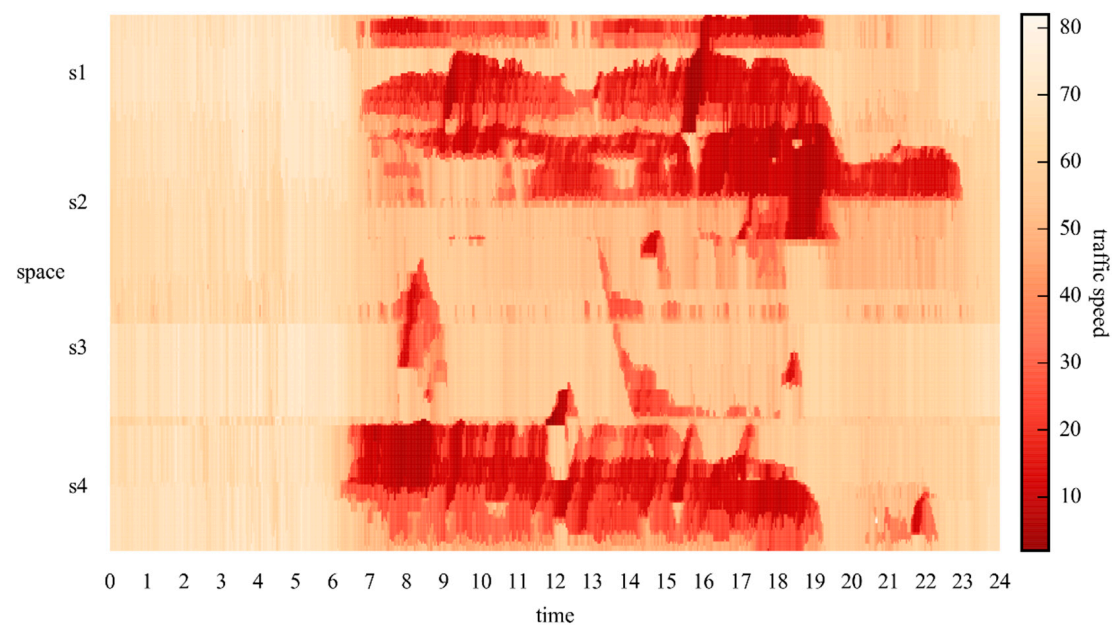 N为时间间隔的长度,Q为路段的长度,像素mij是第i路段在j时刻的平均交通速度。设x轴和y轴分别表示矩阵的时间和空间。生成的矩阵可以看作是图像的一个通道channel,因此,图像的宽度为M像素,高度为N像素。
