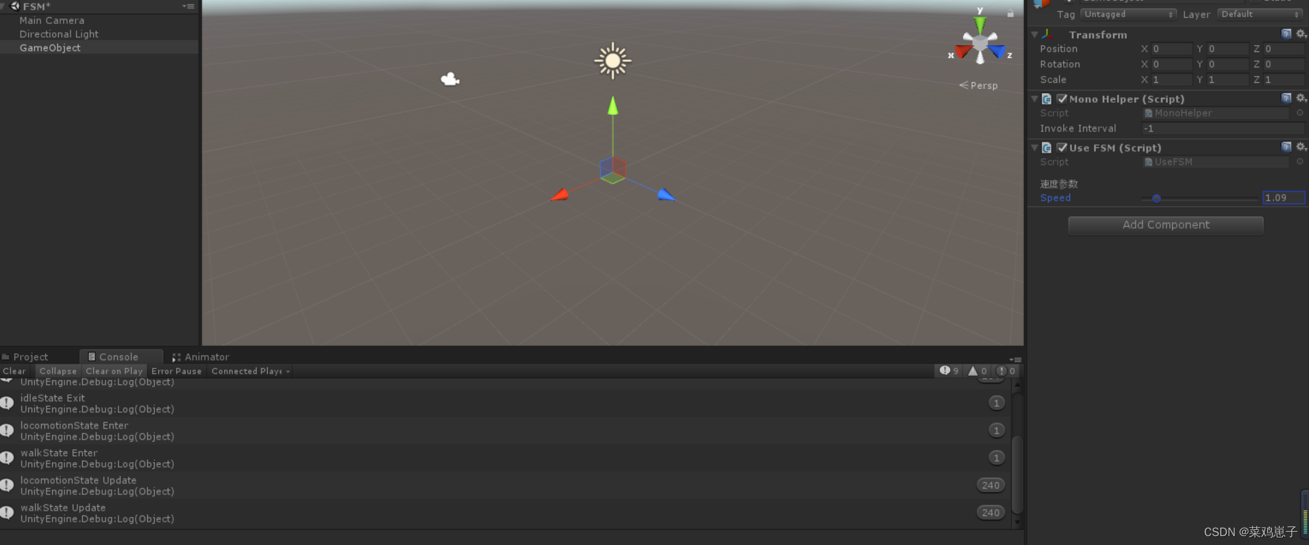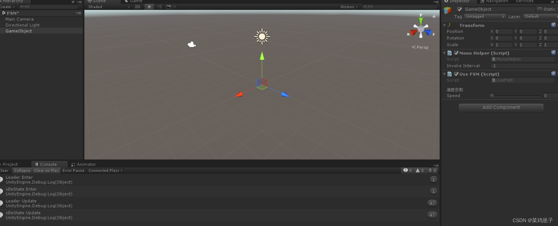 开始的时候可以看出当Speed为0的时候,开始执行一直执行Leader Enter与idleState Enter,然后就一直执行:Leader Update与idleState Update。
