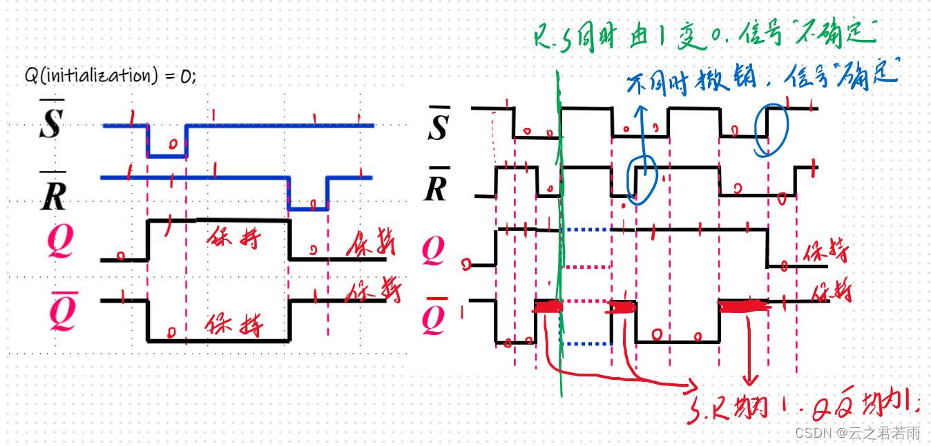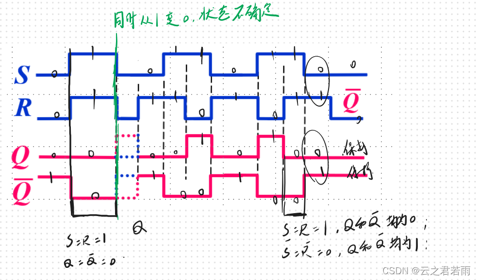 当R和S均为1时,Q和Q非均为1,不满足互补关系,所以说,Q的输出具有随机性(由两个门的传输延迟时间所决定)。因此,我们用“不允许”来表示;