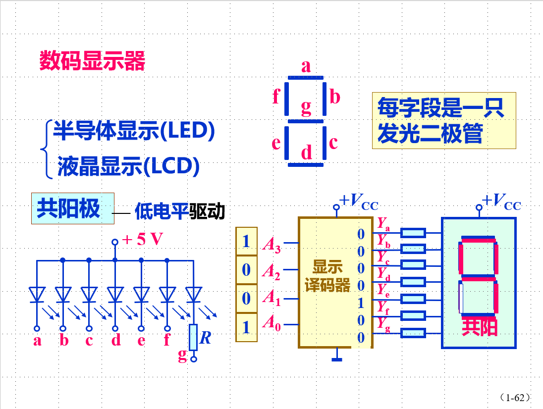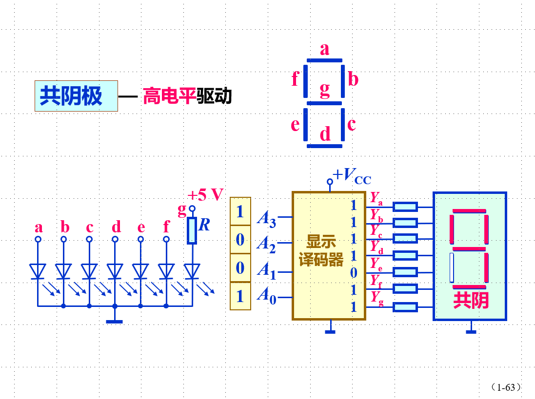 共阴极:高电平驱动;输出为0:灭 输出为1: 亮