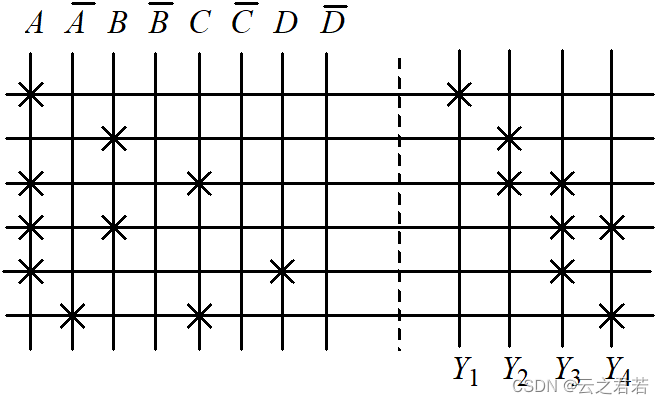 第二步:根据最简与或表达式作出阵列图(横为与,竖为或);