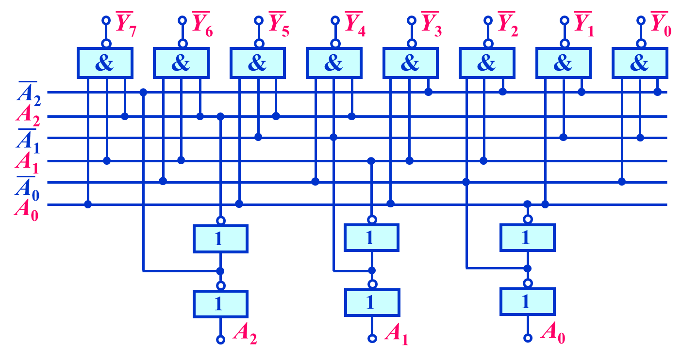 3 - 8 译码器逻辑图(输出低电平有效,即在输出端取非):