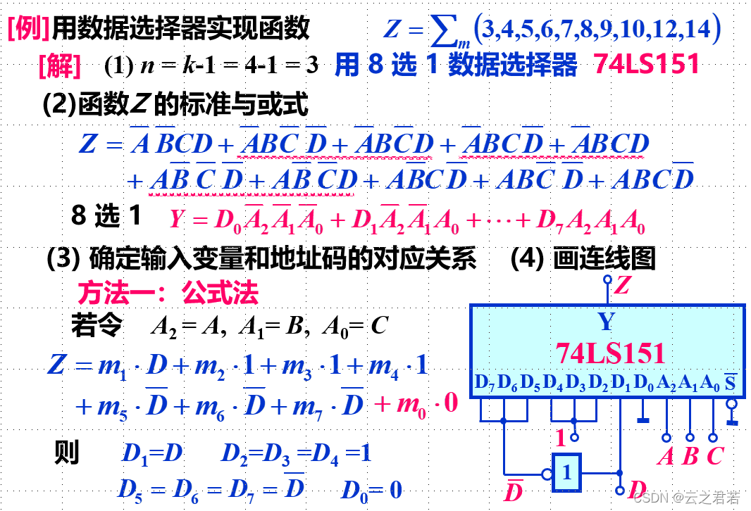 因为任何组合逻辑函数都能以最小项的或的形式表示,而数据选择器的输出均为标准与或式,含地址的最小项,故可以使用数据选择器进行表达;
