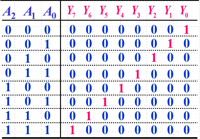 译码器是编码器的逆过程,即将n个二进制输入转化为2^n个输出信号;