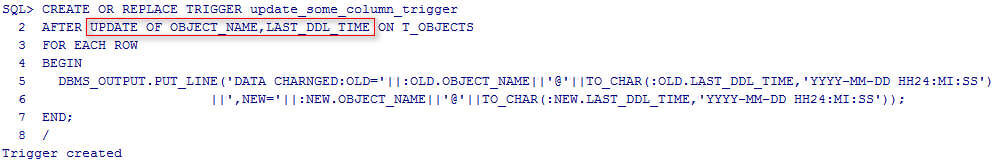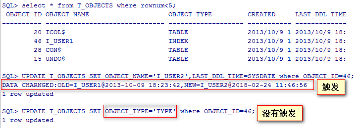 下面用一个简单的案例看一下when的用法,判断OBJECT_NAME字段被修改成不一样的值时才执行触发