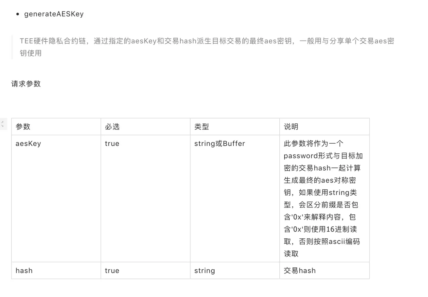 - generateAESKey TEE 硬件隐私合约链,通过指定的 aesKey 和交易 hash 派生目标交易的最终 aes 密钥