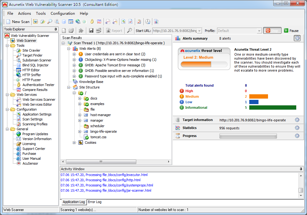 2.在上述的发现阶段或扫描过程之后,WVS就会自动地对所发现的每一个页面发动一系列的漏洞攻击,这实质上是模拟一个黑客的攻击过程。WVS分析每一个页面中可以输入数据的地方,进而尝试所有的输入组合。这是一个自动扫描阶段。
