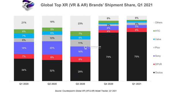 而Oculus Quest 2的推出也帮助Meta公司占据了75%以上的市场份额(2021年第一季度的出货量)。