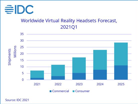 据IDC数据显示,全球VR设备出货量正在提速,预计2021-2025年全球VR头显出货量将保持41%的年复合增速。预计2021年的出货量将由2020年的670万台提升到850万台,2025年更是将达到2860万台。