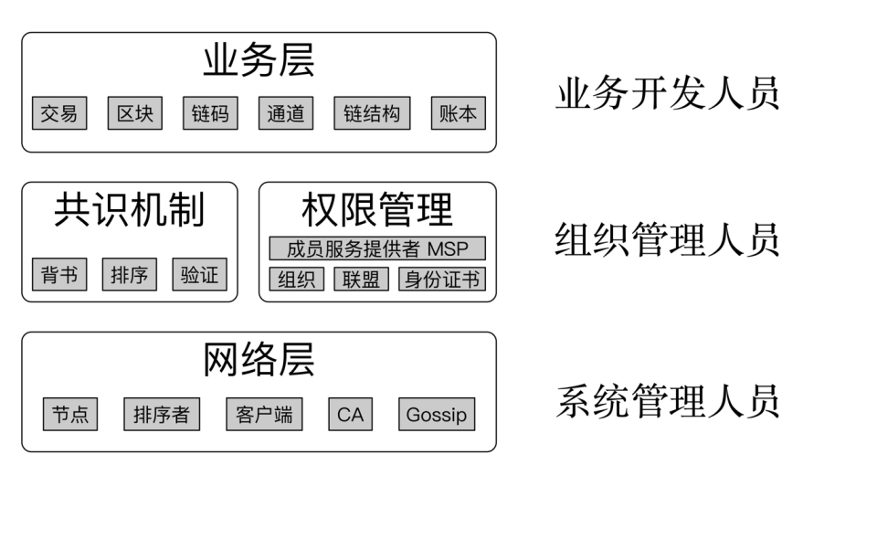 团队构成:fabric联盟链的开发人员主要分为三类:底层是系统运维,负责系统的部署与维护;其次是组织管理人员,负责证书、MSP权限管理、共识机制等;最后是业务开发人员,他们负责编写chaincode、创建维护channel、执行transaction交易等。
