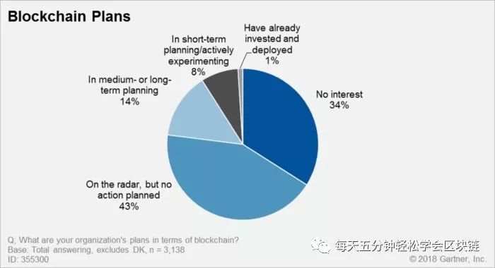 Gartner的2018年首席信息官调查显示,只有1%的首席信息官表示其组织中采用任何形式的区块链,只有8%的首席信息官正在进行短期规划或积极尝试区块链。