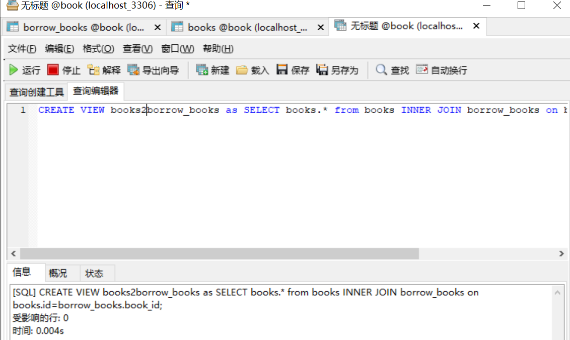 创建视图book2borrow_books 内容是 books表和borrow_books的拼接内容