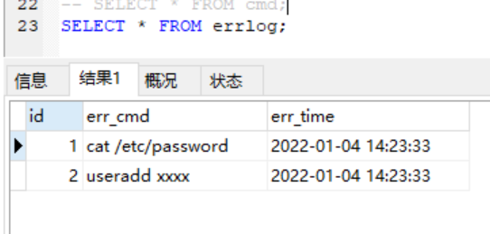 小案例:当cmd表中的记录success字段是no那么就触发触发器的执行去errlog表中插入数据
