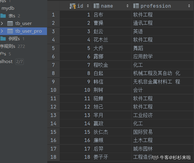 但是此时,tb_user_pro表结构及其数据都已经插入成功了,我们可以直接刷新表结构,检查表结构中的数据。