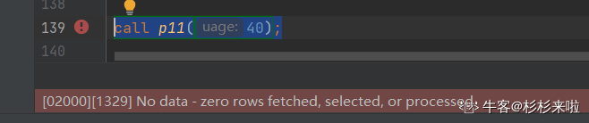 执行结果:上述的存储过程,最终我们在调用的过程中,会报错,之所以报错是因为上面的while循环中,并没有退出条件。当游标的数据集获取完毕之后,再次获取数据,就会报错,从而终止了程序的执行。