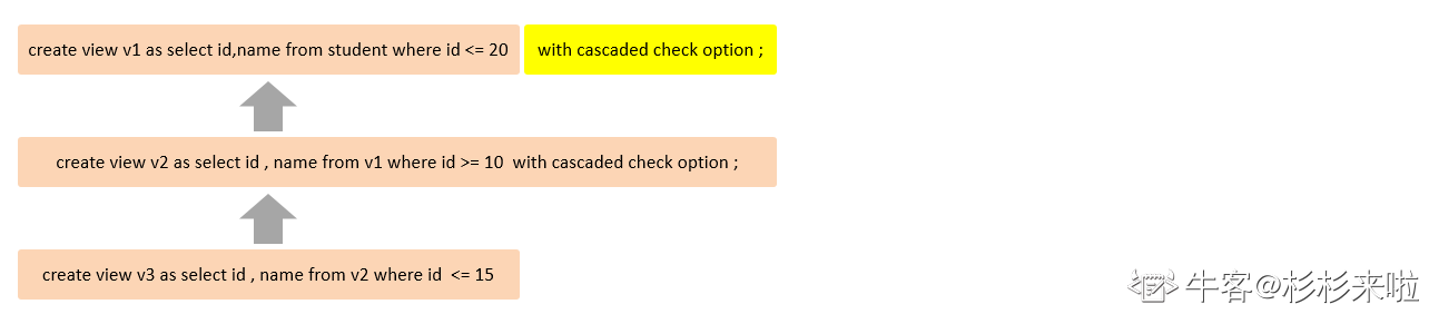 比如,v2视图是基于v1视图的,如果在v2视图创建的时候指定了检查选项为 cascaded,v1视图创建时未指定检查选项。 但在执行检查时,不仅会检查v2,还会级联检查v2的关联视图v1。