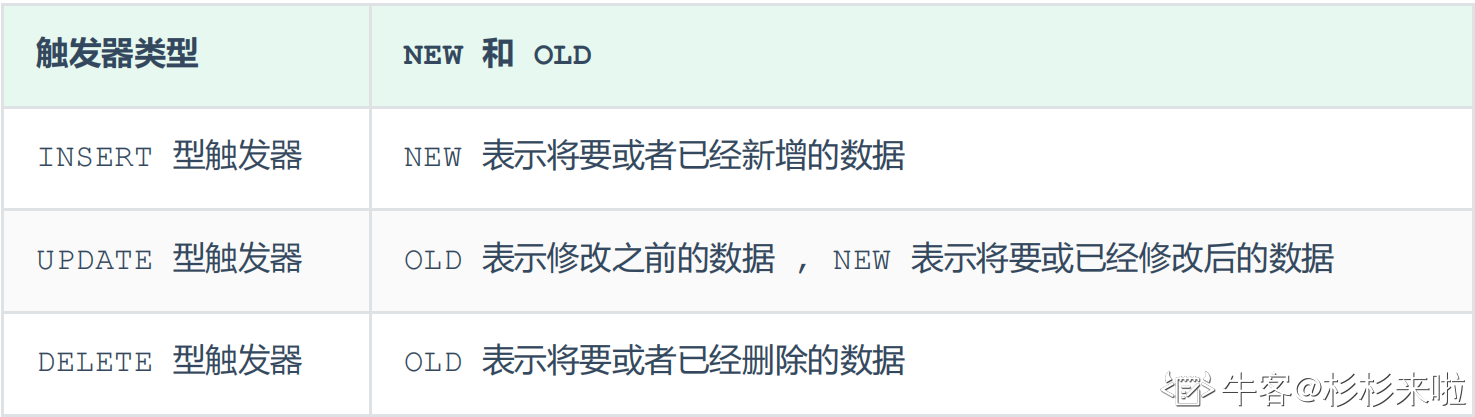 使用别名 OLD 和 NEW 来引用触发器中发生变化的记录内容,这与其他的数据库是相似的。现在触发器还只支持行级触发,不支持语句级触发。
