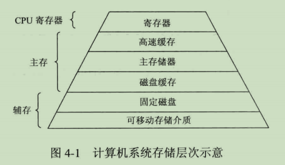 对于通用计算机而言,存储层次至少应具有三级:最高层为CPU寄存器,中间为主存,最底层是辅存。这三层还可进一步划分(如下图),其中CPU寄存器和主存属于操作系统的管辖范畴,掉电后它们中存储的信息不再存在;而辅存则属于持久化保存介质,它们存储的信息会被长期保存。