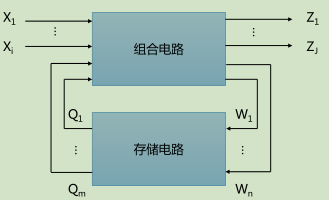 输出方程Z和驱动方程W是用来描述组合逻辑关系的,状态方程Q是用来描述存储电路的新状态Qn+1与原状态Qn和驱动信号W之间的关系。由图可知,一个完整的时序电路是由组合逻辑电路和存储电路组成,它在任何时刻的输出,不仅与该时刻的输入信号有关,而且还与该时刻以前的输入信号有关。