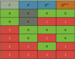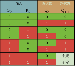 添加了一个控制信号C,RD = RC,SD = SC,根据电路图写出门控RS锁存器的特性表如图所示: