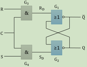 门控RS锁存器是在原来的RS锁存器的基础上添加了一个控制端,只有控制端的信号变为有效电平后,RS锁存器才能按照输入的置1或者置0信号改变相应的状态。结构图如图所示: