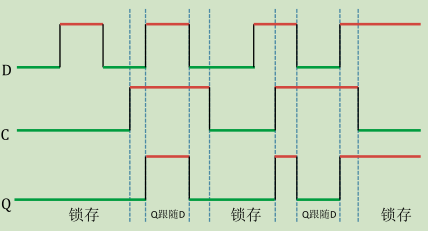 由图可知,D是锁存器的输入信号,C是锁存器的控制信号,Q是锁存器的输出信号,当C = 1时,Q随着D的变化而变化;当C = 0时,Q会被锁存而不再变化。