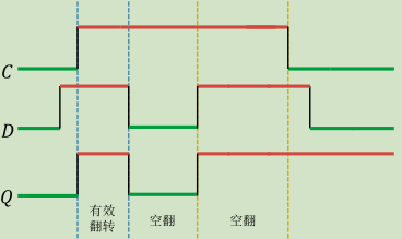 空翻:锁存器中存在空翻现象,当控制信号有效时,输入信号若发生多次变化,输出状态也跟着发生多次变化,这一现象就被称为锁存器的空翻。空翻波形示意图如图所示: