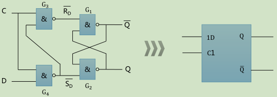 D锁存器:能够将输入端的单路数据D存入到锁存器中的电路,为了解决RS锁存器不能同时为1带来的问题。D锁存器的电路图和逻辑符号如图所示: