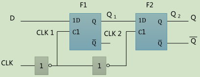 FPGA设计中使用更多的是D触发器(D-type flip-flops)—— DFF,DFF由两个相同的D锁存器以及两个非门连接而成,DFF的电路图如下图所示:
