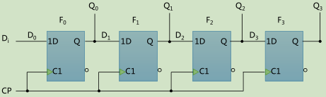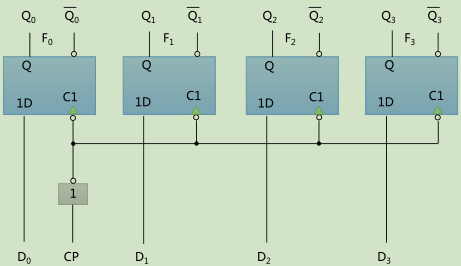 寄存器是能够存储多位二进制数的时序电路,寄存器是由多个触发器组成的。由四位D触发器组成的寄存器如图所示: