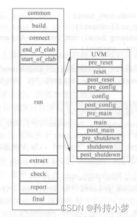 例如 phase 机制,phase 机制主要是使得 UVM 的运行仿真层次化,使得 各种例化先后次序正确。UVM 的 phase 机制主要有 9 个,外加 12 个小 phase。 主要的 phase 有 build_phase、connect_phase、run_phase、report_phase、 final_phase 等,其中除了 run_phase 是 task(会消耗仿真时间),其余都是 function,然后 build_phase 和 final_phase 都是自顶向下运行,其余都是自 底向上运行。run_phase 和 12 个小 phase( reset_phase、configure_phase、 main_phase、shutdown_phase)是并行运行的,有这 12 个小 phase 主要是进 一步将 run phase 中的事务划分到不同的 phase 进行,简化代码。注意,run phase 和 12 个小 phase 最好不要同时使用。从运行上来看,9 个 phase 顺 序执行,不同组件中的同一个 phase 执行有顺序,build phase 为自顶向下, 只有同一个 phase 全部执行完毕才会执行下一个 phase。