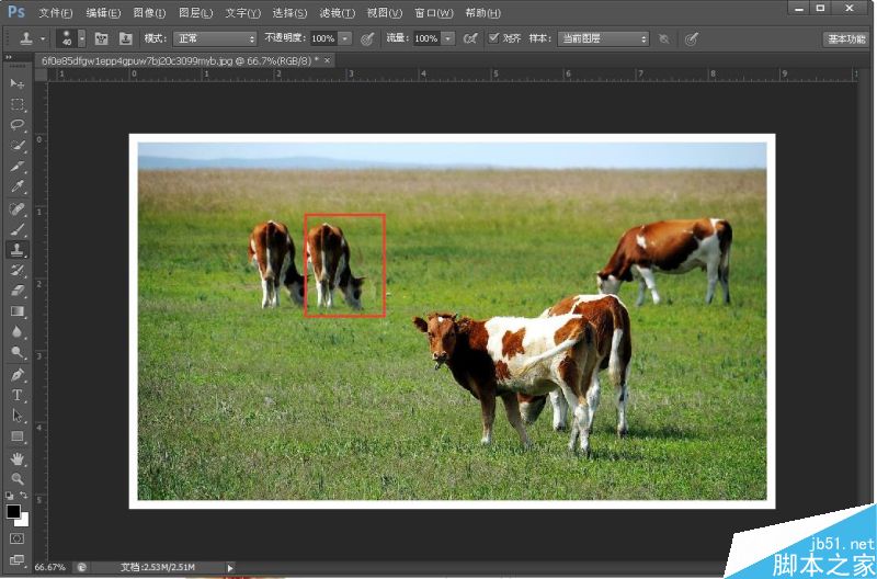 下面我们再次利用仿制图章工具,将右边的那头牛让它消失掉;