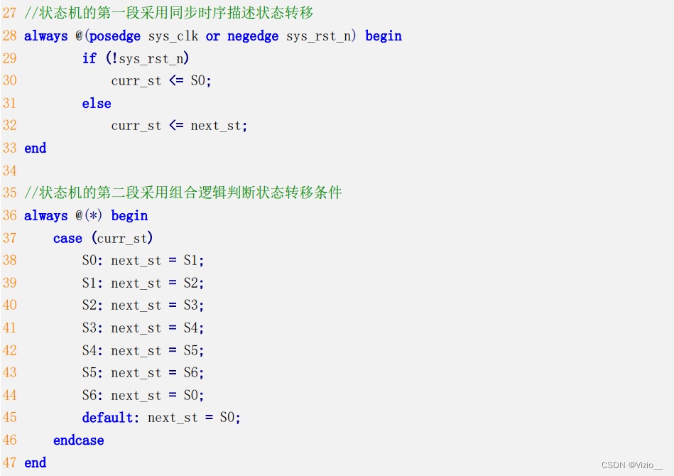 接下来就可以使用三个 always 语句来开始编写状态机的代码,第一个always 采用同步时序描述状态转 移,第二个always采用组合逻辑判断状态转移条件,第三个 always 是描述状态输出,一个完整的三段式状态机的例子如下代码所示: