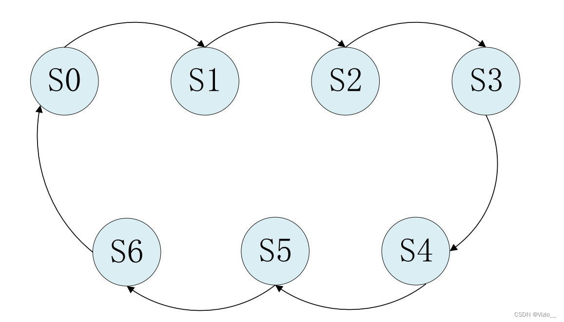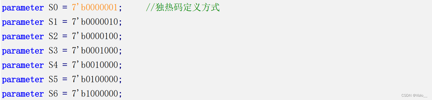 这里是使用独热码的方式来定义状态机,每个状态只有一位为 1,当然也可以直接定义成十进制的 0,1,2……7。