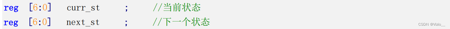 因为我们定义成独热码的方式,每一个状态的位宽为 7 位,接下来还需要定义两个 7 位的寄存器,一个用来表示当前状态,另一个用来表示下一个状态,如下所示: