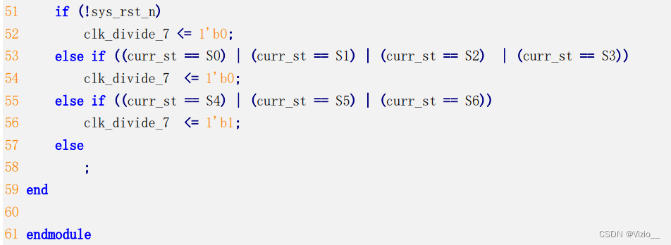 在编写状态机代码时首先要定义状态变量(代码中的参数 S0~S6)与状态寄存器(curr_st、next_st),如代码中第 10 行至第 21 行所示;接下来使用三个 always 语句来实现三段状态机,第一个 always 语句实现同步状态跳转(如代码的第 27 至第 33 行所示),在复位的时候,当前状态处在 S0 状态,否则将下一个状态赋值给当前状态;第二个 always 采用组合逻辑判断状态转移条件(如代码的第 35 行至第 47 行代码所示),这里每一个状态只保持一个时钟周期,也就是直接跳转到下一个状态,在实际应用中,一般根据输入的条件来判断是否跳转到其它状态或者停留在当前转态,最后在 case 语句后面增加一个 default 语句,来防止状态机处在异常的状态;第三个 always 输出分频后的时钟(如代码的第 49 至第 59 行代码所示),状态机的第三段可以使用组合逻辑电路输出,也可以使用时序逻辑电路输出,一般推荐使用时序电路输出,因为状态机的设计和其它设计一样,最好使用同步时序方式设计,以提高设计的稳定性,消除毛刺。从代码中可以看出,输出的分频时钟 clk_divide_7 只与当前状态(curr_st)有关,而与输入状态无关,从代码中可以看出,输出的分频时钟 clk_divide_7 只与当前状态(curr_st)有关,而与输入状态无关,状态;状态机的第二段对应摩尔状态机模型产生下一状态的组合逻辑 F;状态机的第三段对应摩尔状态机产生输出的组合逻辑 G,因为采用时序电路输出有很大的优势,所以这里第三段状态机是由时序电路输出的。