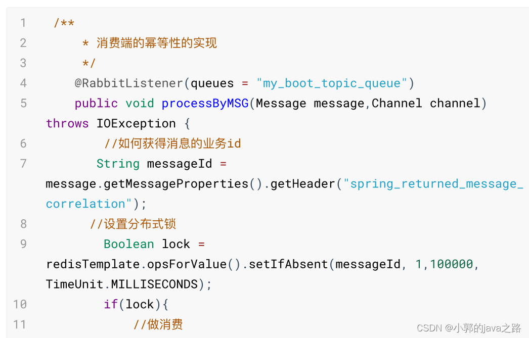 1、消息携带业务id,消费者去查询数据库是否存在数据,如果存在证明已经消费过,不处理。或者插入,插入利用主键唯一性约束,插入不成功报键重复异常。