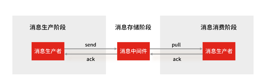首先来看消息丢失的环节,一条消息从生产到消费完成这个过程,可以划分三个阶段,分别为消息生产阶段,消息存储阶段和消息消费阶段
